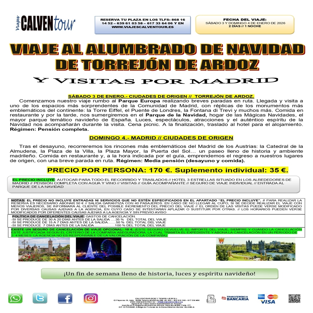 PRECIO POR PERSONA: 170 €. Suplemento individual: 35 €.