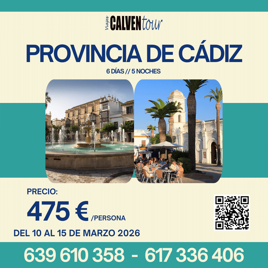 Desayuno y salida hacia Cádiz, la histórica Tacita de Plata. Visitas a la Catedral, Ayuntamiento, Monumento a la Constitución de 1812, recorrido panorámico en autobús y tiempo libre. Comida en el hotel. Por la tarde, visita a El Puerto de Santa María. Cena y alojamiento. Régimen: Pensión Completa.