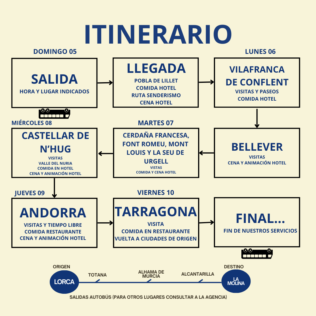 NOTAS: EL PRECIO NO INCLUYE ENTRADAS NI SERVICIOS QUE NO ESTÉN ESPECIFICADOS EN EL APARTADO “EL PRECIO INCLUYE”. // PARA REALIZAR LA RESERVA ES NECESARIO ABONAR 50 € // SALIDA GARANTIZA CON 40 PASAJEROS. EN CASO DE NO LLEGAR AL CUPO, SI SE DECIDE REALIZAR EL VIAJE CON MENOS VIAJEROS, SE INFORMARÁ AL CLIENTE DEL POSIBLE INCREMENTO DEL PRECIO DEL VIAJE // EL ORDEN DE LAS VISITAS PUEDE VERSE MODIFICADO POR DIVERSAS CAUSAS AJENAS A LA AGENCIA, EN CUYO CASO SE INTENTARÁN APLAZAR O SUSTITUIR POR OTRAS. // LOS HORARIOS PUEDEN VERSE MODIFICADOS POR DIFERENTES CAUSAS AJENAS A LA AGENCIA Y SIN PREVIO AVISO