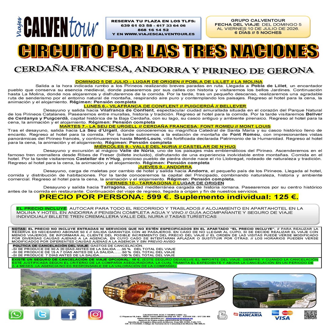 PRECIO POR PERSONA: 599 €. Suplemento individual: 125 €.