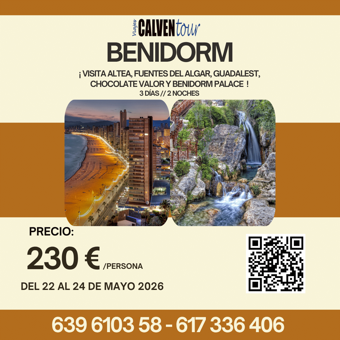 Desayuno y salida hacia Callosa d’en Sarrià para descubrir el impresionante paraje natural de Las Fuentes del Algar, un rincón de aguas cristalinas y naturaleza espectacular que invita a respirar y disfrutar. Tras la visita, regreso al hotel para la comida. Por la tarde, nos trasladaremos a Altea, uno de los pueblos más bellos y con más encanto de la Costa Blanca. Sus calles blancas, su casco antiguo con vistas al Mediterráneo y su ambiente bohemio nos conquistarán. Regreso al hotel para la cena y, como broche de oro del día, traslado al Benidorm Palace para asistir al espectacular show “Avibe”, una combinación de música, luz, acrobacias y talento que promete sorprender y emocionar. Finalizado el espectáculo, regreso al hotel y alojamiento. Régimen: Pensión Completa.