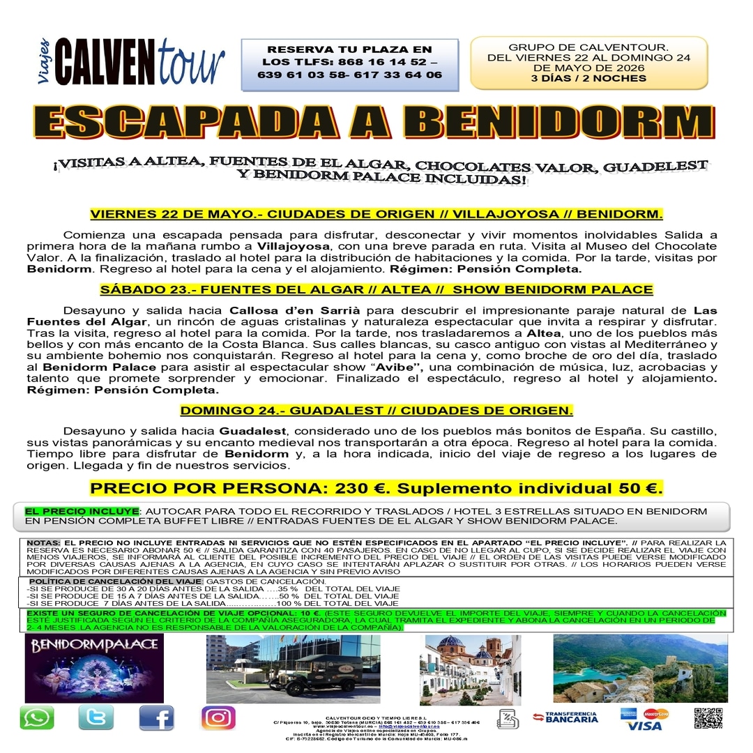 SÁBADO 23.- FUENTES DEL ALGAR // ALTEA // SHOW BENIDORM PALACE