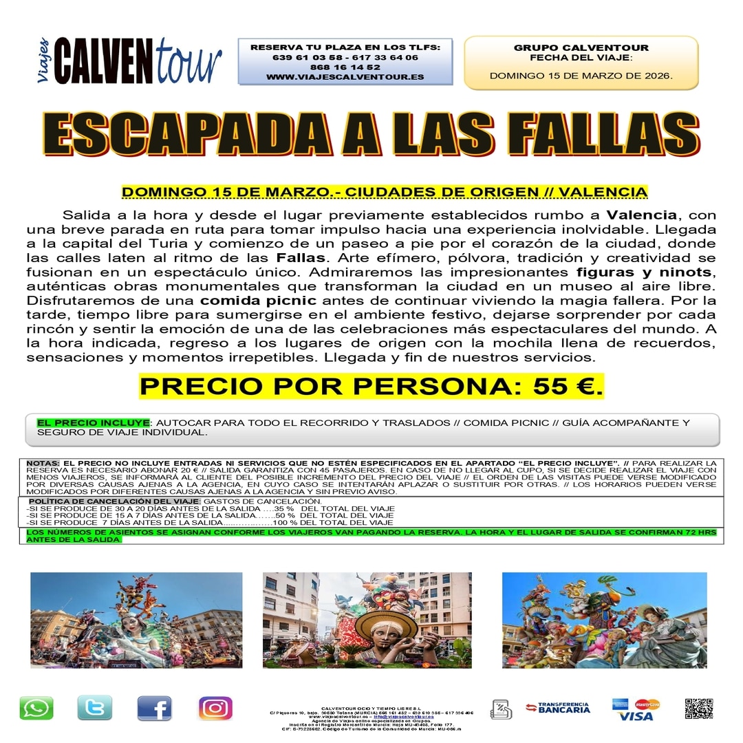 Salida a la hora y desde el lugar previamente establecidos rumbo a Valencia, con una breve parada en ruta para tomar impulso hacia una experiencia inolvidable. Llegada a la capital del Turia y comienzo de un paseo a pie por el corazón de la ciudad, donde las calles laten al ritmo de las Fallas. Arte efímero, pólvora, tradición y creatividad se fusionan en un espectáculo único. Admiraremos las impresionantes figuras y ninots, auténticas obras monumentales que transforman la ciudad en un museo al aire libre. Disfrutaremos de una comida picnic antes de continuar viviendo la magia fallera. Por la tarde, tiempo libre para sumergirse en el ambiente festivo, dejarse sorprender por cada rincón y sentir la emoción de una de las celebraciones más espectaculares del mundo. A la hora indicada, regreso a los lugares de origen con la mochila llena de recuerdos, sensaciones y momentos irrepetibles. Llegada y fin de nuestros servicios.