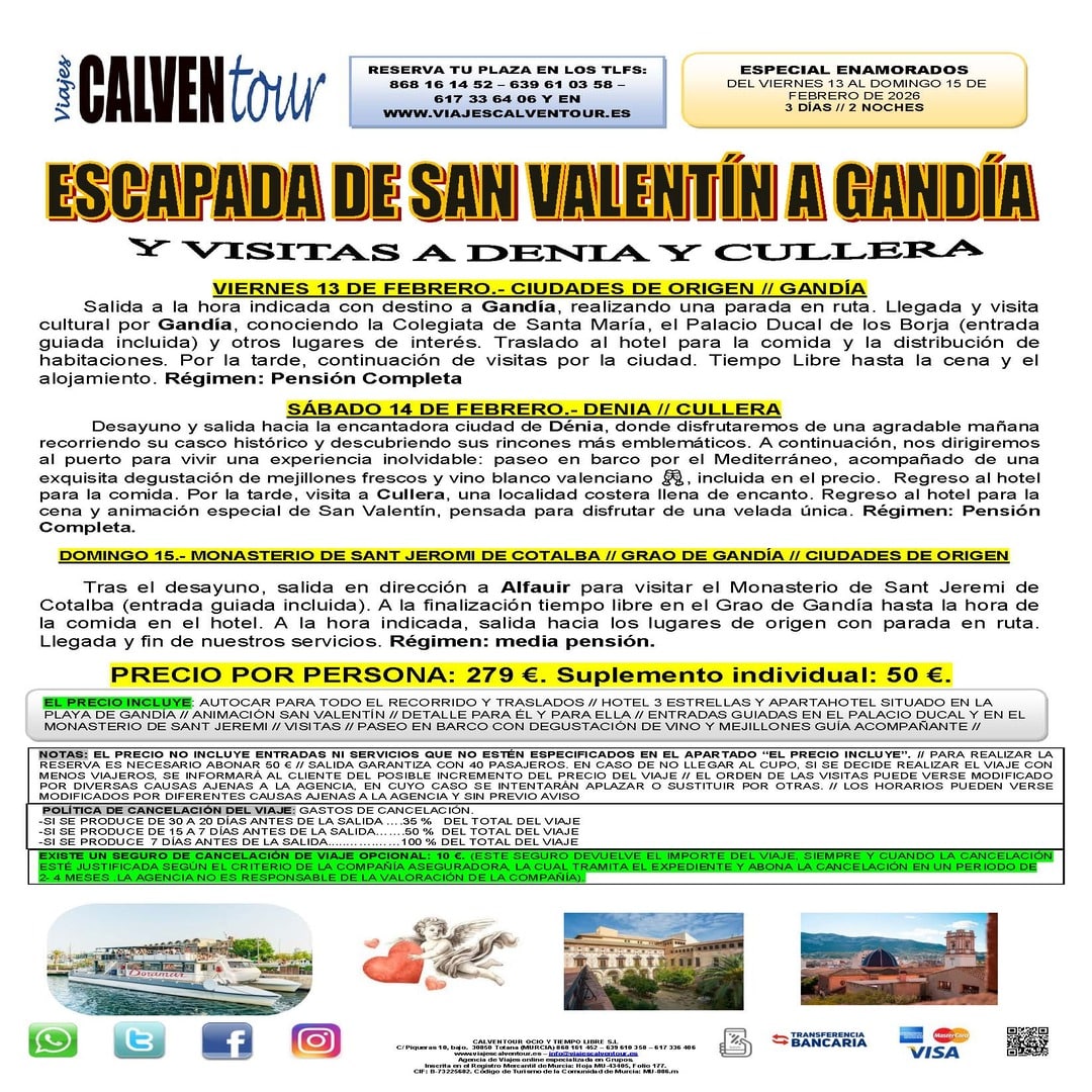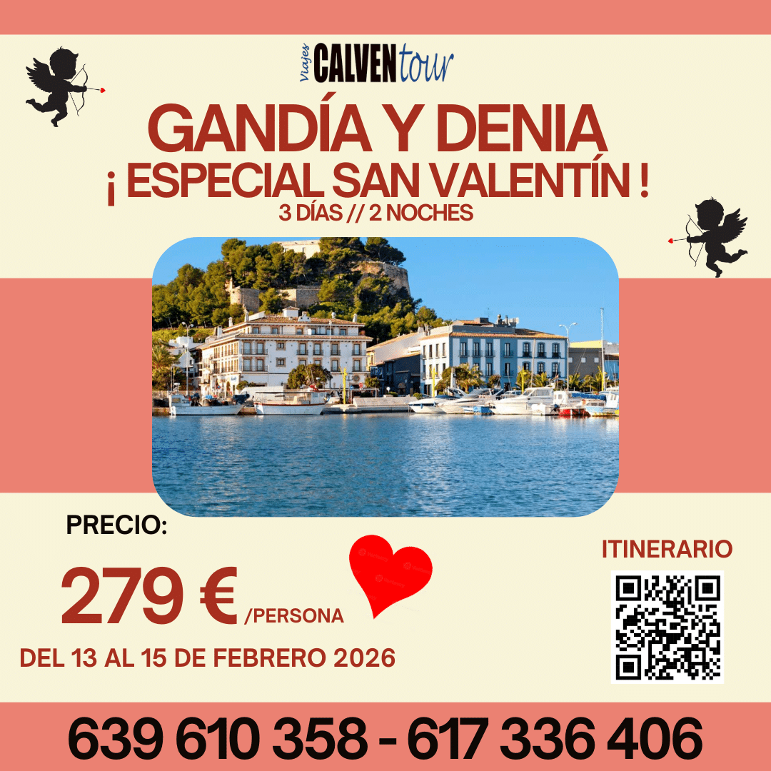 Desayuno y salida hacia la encantadora ciudad de Dénia, donde disfrutaremos de una agradable mañana recorriendo su casco histórico y descubriendo sus rincones más emblemáticos. A continuación, nos dirigiremos al puerto para vivir una experiencia inolvidable: paseo en barco por el Mediterráneo, acompañado de una exquisita degustación de mejillones frescos y vino blanco valenciano 🥂, incluida en el precio. Regreso al hotel para la comida. Por la tarde, visita a Cullera, una localidad costera llena de encanto. Regreso al hotel para la cena y animación especial de San Valentín, pensada para disfrutar de una velada única. Régimen: Pensión Completa.