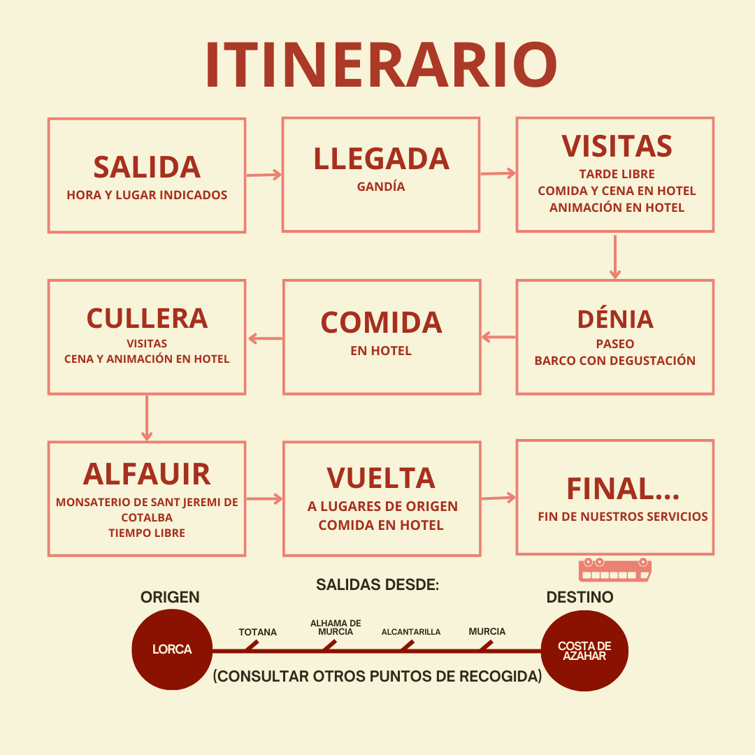 Salida a la hora indicada con destino a Gandía, realizando una parada en ruta. Llegada y visita cultural por Gandía, conociendo la Colegiata de Santa María, el Palacio Ducal de los Borja (entrada guiada incluida) y otros lugares de interés. Traslado al hotel para la comida y la distribución de habitaciones. Por la tarde, continuación de visitas por la ciudad. Tiempo Libre hasta la cena y el alojamiento. Régimen: Pensión Completa