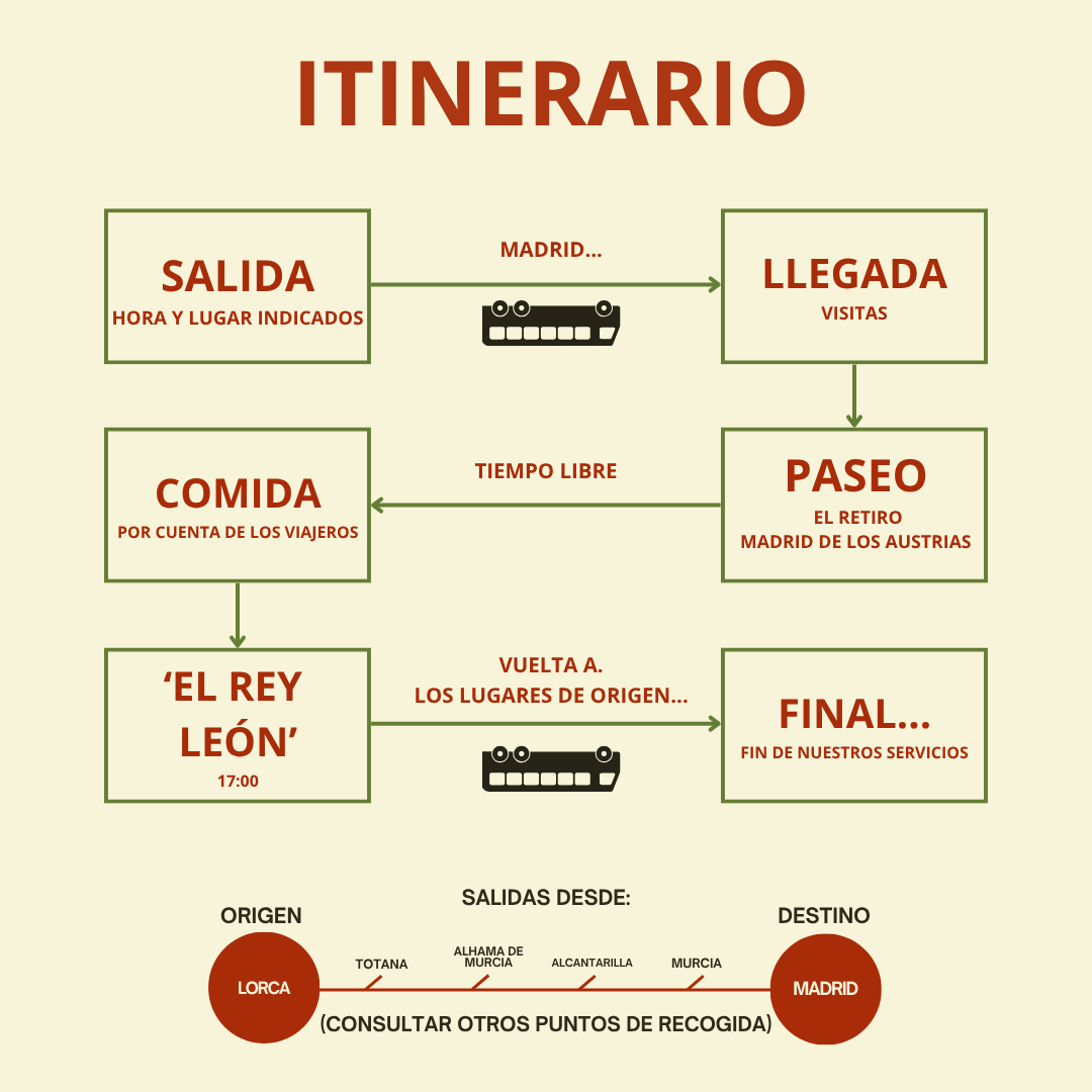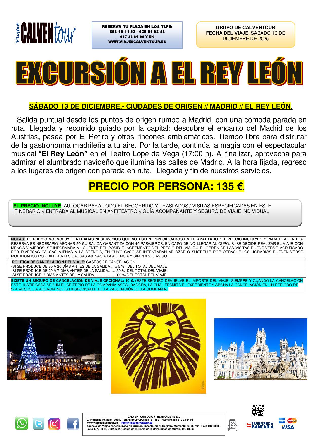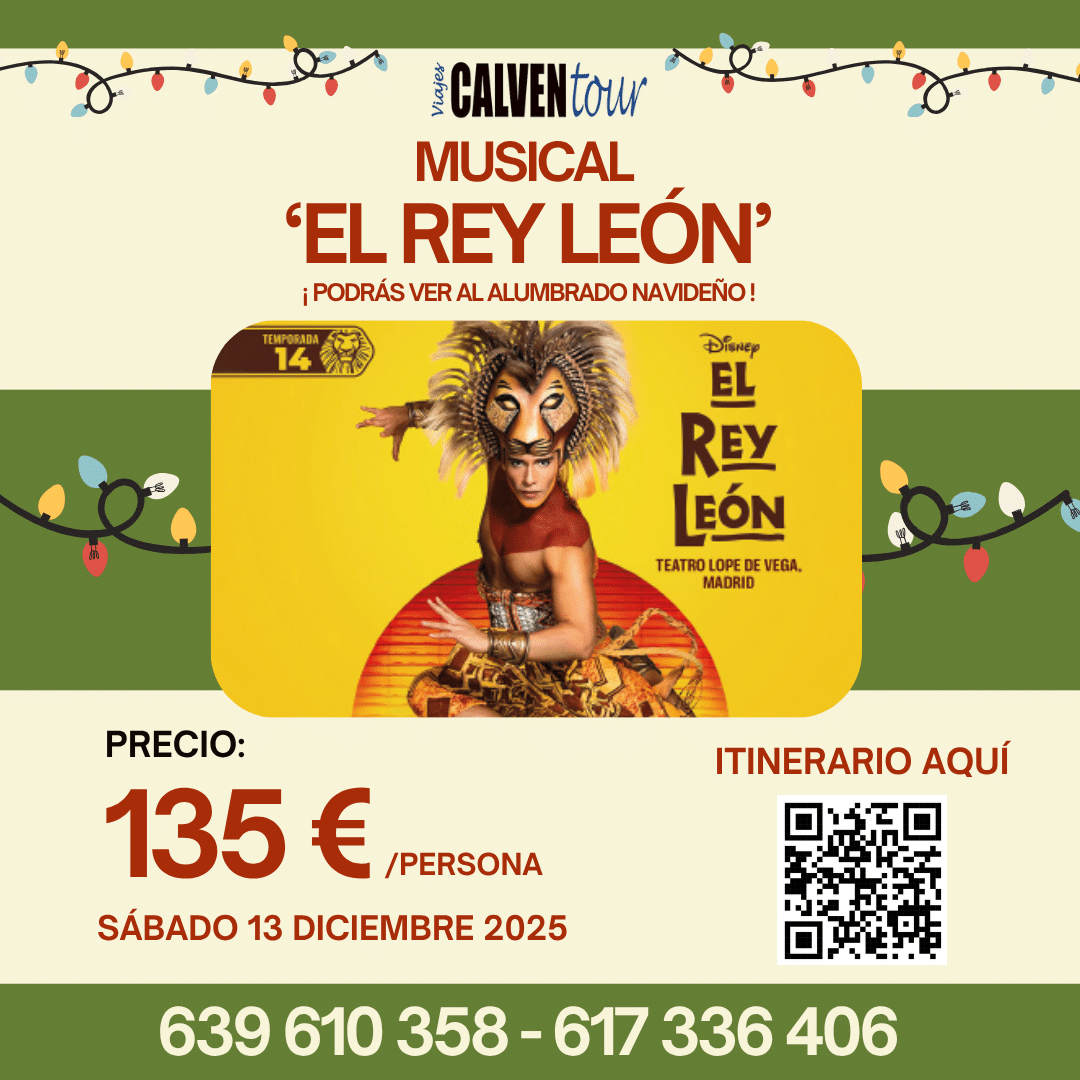 Salida puntual desde los puntos de origen rumbo a Madrid, con una cómoda parada en ruta. Llegada y recorrido guiado por la capital: descubre el encanto del Madrid de los Austrias, pasea por El Retiro y otros rincones emblemáticos. Tiempo libre para disfrutar de la gastronomía madrileña a tu aire. Por la tarde, continúa la magia con el espectacular musical “El Rey León” en el Teatro Lope de Vega (17:00 h). Al finalizar, aprovecha para admirar el alumbrado navideño que ilumina las calles de Madrid. A la hora fijada, regreso a los lugares de origen con parada en ruta. Llegada y fin de nuestros servicios.
