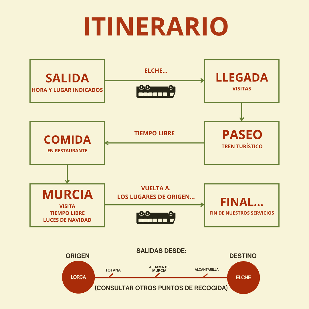 Salida a la hora acordada en dirección hacia Elche, realizando una parada en ruta. Llegada a esta Ciudad, donde realizaremos un recorrido en Tren Turístico con una duración de 45 min aproximadamente (incluido en el precio). Terminado este, visita al Parque Municipal, Basílica Menor de Santa María y zona céntrica. Tiempo libre en el centro de la ciudad. A continuación, traslado al restaurante para la comida y baile. Por la tarde, visita al centro de la Ciudad  de Murcia para ver la iluminación Navideña de las calles del casco antiguo, con su Mercadillo y  Belenes expuestos al público. A la hora indicada por el guía regreso a los lugares de origen.