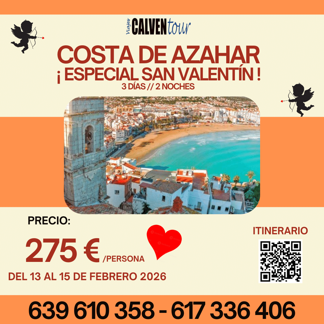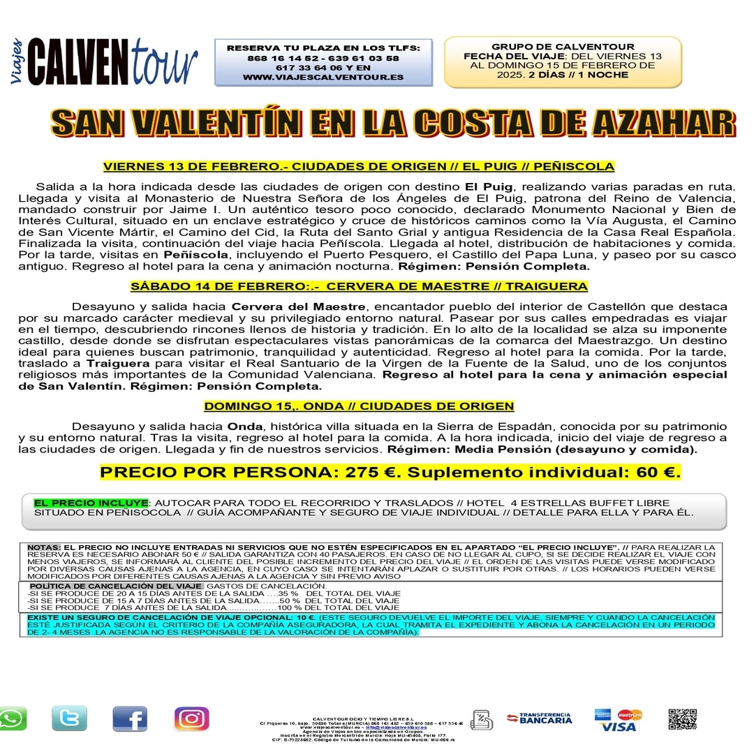Desayuno y salida hacia Cervera del Maestre, encantador pueblo del interior de Castellón que destaca por su marcado carácter medieval y su privilegiado entorno natural. Pasear por sus calles empedradas es viajar en el tiempo, descubriendo rincones llenos de historia y tradición. En lo alto de la localidad se alza su imponente castillo, desde donde se disfrutan espectaculares vistas panorámicas de la comarca del Maestrazgo. Un destino ideal para quienes buscan patrimonio, tranquilidad y autenticidad. Regreso al hotel para la comida. Por la tarde, traslado a Traiguera para visitar el Real Santuario de la Virgen de la Fuente de la Salud, uno de los conjuntos religiosos más importantes de la Comunidad Valenciana. Regreso al hotel para la cena y animación especial de San Valentín. Régimen: Pensión Completa.
