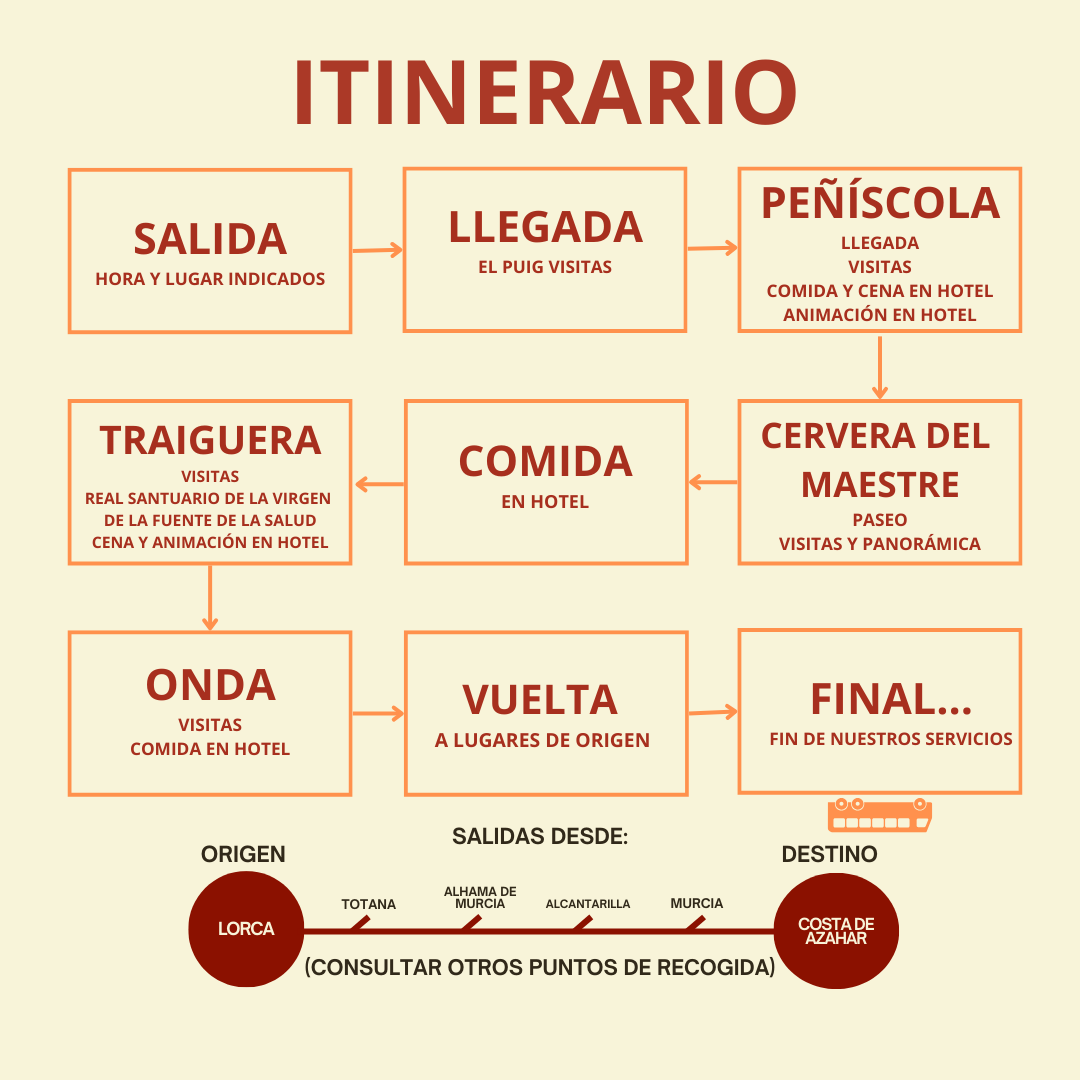 Salida a la hora indicada desde las ciudades de origen con destino El Puig, realizando varias paradas en ruta. Llegada y visita al Monasterio de Nuestra Señora de los Ángeles de El Puig, patrona del Reino de Valencia, mandado construir por Jaime I. Un auténtico tesoro poco conocido, declarado Monumento Nacional y Bien de Interés Cultural, situado en un enclave estratégico y cruce de históricos caminos como la Vía Augusta, el Camino de San Vicente Mártir, el Camino del Cid, la Ruta del Santo Grial y antigua Residencia de la Casa Real Española. Finalizada la visita, continuación del viaje hacia Peñíscola. Llegada al hotel, distribución de habitaciones y comida. Por la tarde, visitas en Peñíscola, incluyendo el Puerto Pesquero, el Castillo del Papa Luna, y paseo por su casco antiguo. Regreso al hotel para la cena y animación nocturna. Régimen: Pensión Completa.
