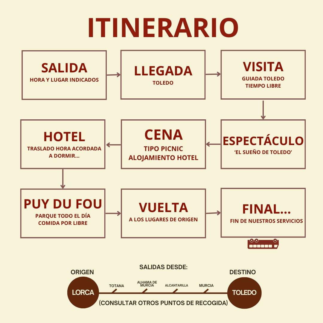 Salida a la hora indicada en dirección a Toledo realizando varias paradas en ruta. Llegada y comida en restaurante. Por la tarde, recorreremos la majestuosa Ciudad Imperial, conocida también como la Ciudad de las Tres Culturas y distinguida por la UNESCO como Patrimonio de la Humanidad. Tras la visita guiada, dispondremos de tiempo libre para pasear y dejarnos sorprender por sus rincones únicos. Al anochecer, nos trasladaremos al Parque Puy du Fou para vivir la magia del espectáculo “El Sueño de Toledo” (entrada en preferente incluida). Una cena tipo picnic completará la velada antes de dirigirnos al hotel, donde realizaremos la distribución de habitaciones y el alojamiento. Régimen: Pensión completa.
