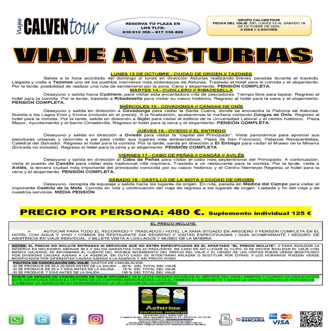 EXISTE UN SEGURO DE CANCELACIÓN DE VIAJE OPCIONAL: 10 €. (ESTE SEGURO DEVUELVE EL IMPORTE DEL VIAJE, SIEMPRE Y CUANDO LA CANCELACIÓN ESTÉ JUSTIFICADA SEGÚN EL CRITERIO DE LA COMPAÑÍA ASEGURADORA, LA CUAL TRAMITA EL EXPEDIENTE Y ABONA LA CANCELACIÓN EN UN PERIODO DE
