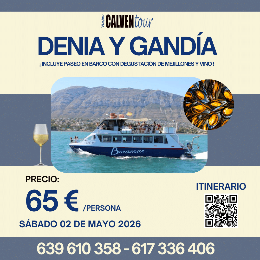 Salida a la hora acordada en dirección a la localidad costera de Denia, realizando una parada en ruta. Llegada y visita durante toda la mañana a esta población costera (Casco Antiguo, Museo del Juguete y Museo del Mar). A la hora acordada por el guía, traslado al Puerto para realizar un paseo en barco y disfrutar de una degustación de mejillones y vino blanco valenciano, con una duración de 1 hora aproximada (incluido en el precio). Terminado el paseo, desplazamiento hacia el restaurante para la comida. Por la tarde tiempo libre en la zona comercial del paseo marítimo de Gandía. A la hora acordada por el guía acompañante, regreso a los lugares de origen.