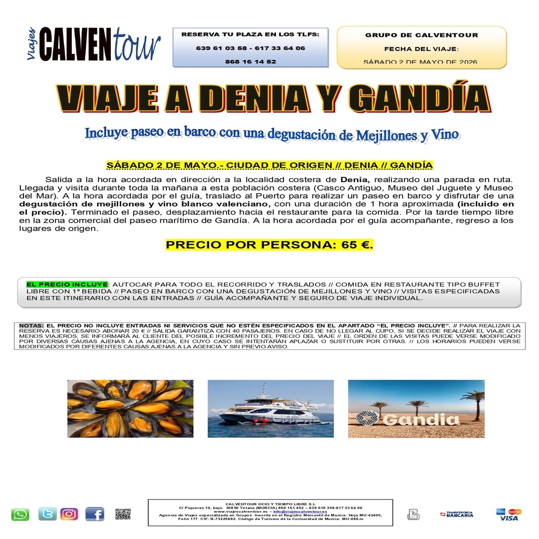 VIAJE A DÉNIA Y GANDÍA. SÁBADO 02 DE MAYO 2026.