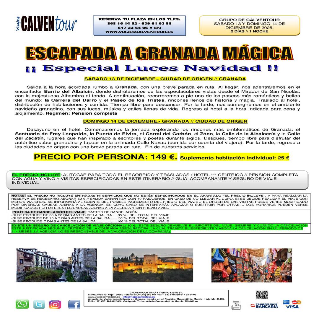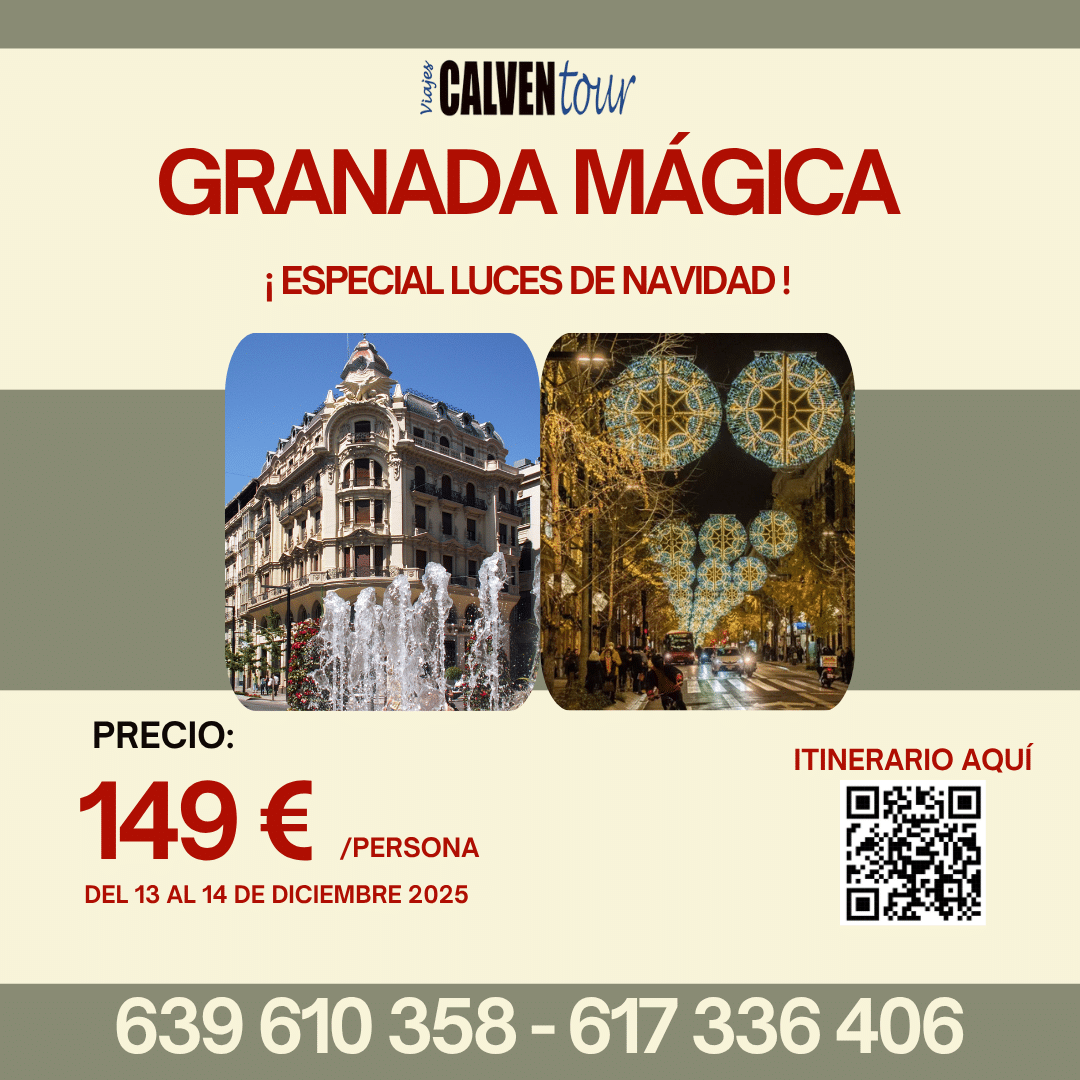 Salida a la hora acordada rumbo a Granada, con una breve parada en ruta. Al llegar, nos adentraremos en el encantador Barrio del Albaicín, donde disfrutaremos de las espectaculares vistas desde el Mirador de San Nicolás, con la majestuosa Alhambra al fondo. A continuación, recorreremos a pie uno de los paseos más románticos y bellos del mundo: la Carrera del Darro y el Paseo de los Tristes, rincones llenos de historia y magia. Traslado al hotel, distribución de habitaciones y comida. Tiempo libre para descansar. Por la tarde, nos sumergiremos en el ambiente navideño granadino, con sus luces, música y calles llenas de vida. Regreso al hotel a la hora indicada para cena y alojamiento. Régimen: Pensión completa