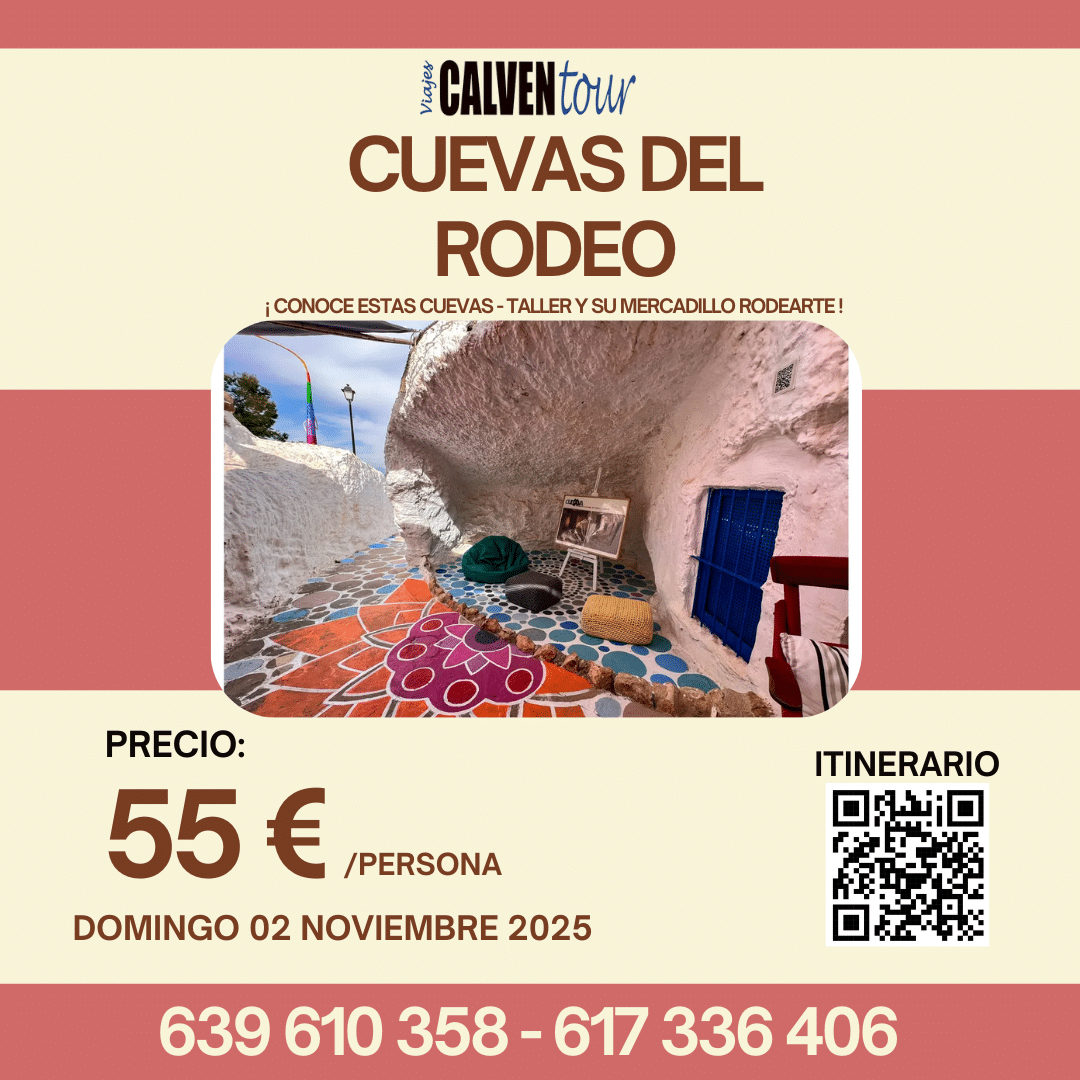 EL PRECIO INCLUYE: AUTOCAR PARA TODO EL RECORRIDO Y TRASLADOS / VISITA A LAS CUEVAS DEL RODEO // VISITAS ESPECIFICADAS EN ESTE ITINERARIO // COMIDA EN RESTAURANTE CON ENSALADA Y A ELEGIR ENTRE 2 PRIMEROS Y 2 SEGUNDOS PLATOS, 1 BEBIDA, POSTRE Y CAFÉ // GUÍA ACOMPAÑANTE Y SEGURO DE VIAJE INDIVIDUAL