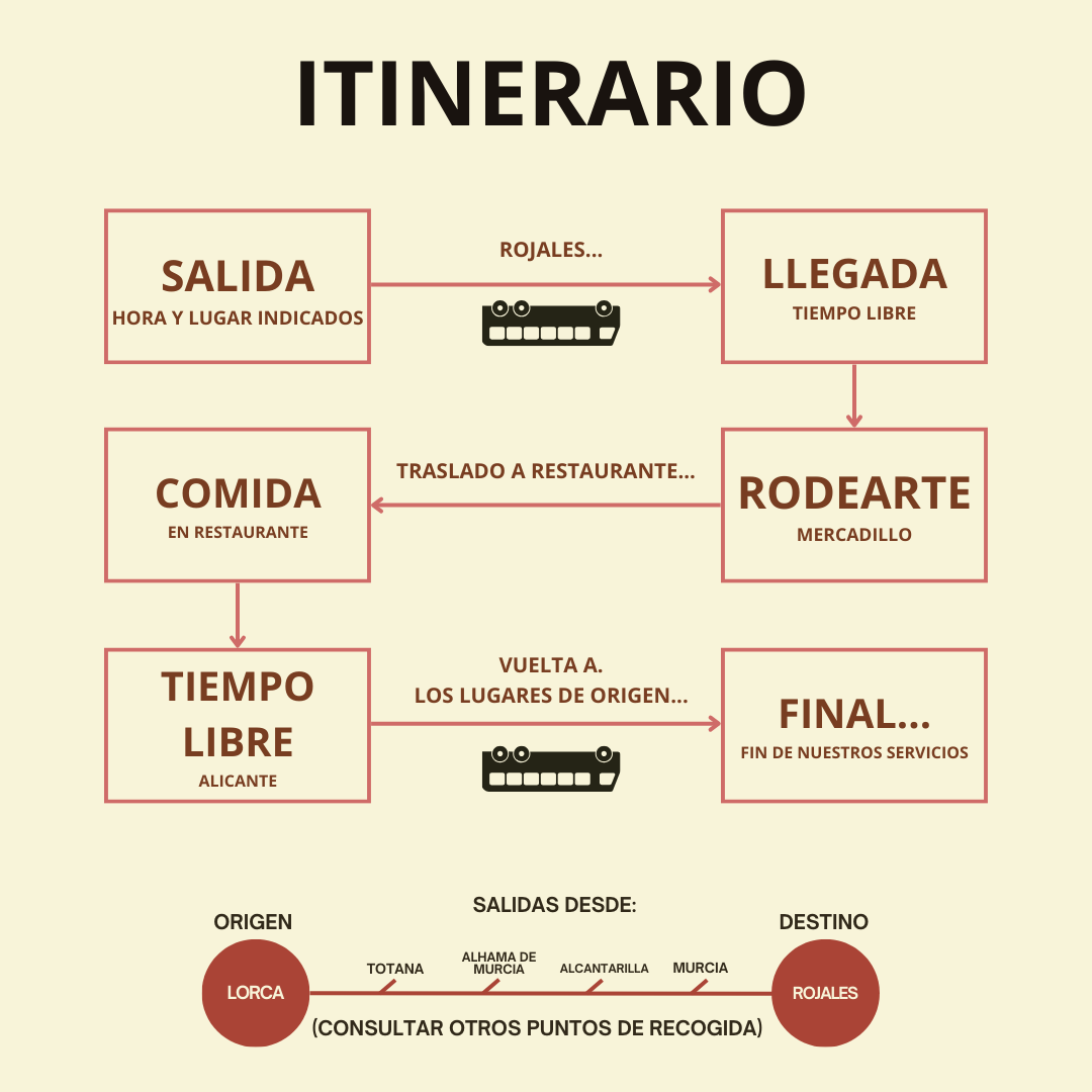 Salida a hora acordada en dirección Cuevas del Rodeo (Rojales) realizando una parada en ruta. Llegada y tiempo libre para poder ver este conjunto de cuevas-taller que pueden ser visitadas mientras los artesanos y artistas están trabajando en ellas. El primer Domingo de cada mes tiene lugar encuentro-fiesta que llamamos Rodearte, del que disfrutaremos este día. A la hora fijada, traslado al restaurante ubicado a las afueras de Alicante para la comida. Por la tarde desplazamiento a la ciudad de Alicante, visita por el centro y tiempo libre para disfrutar en su maravilloso Paseo de la Explanada de España, Paseo Marítimo, etc. A la hora fijada con el guía acompañante, regreso a los lugares de origen.