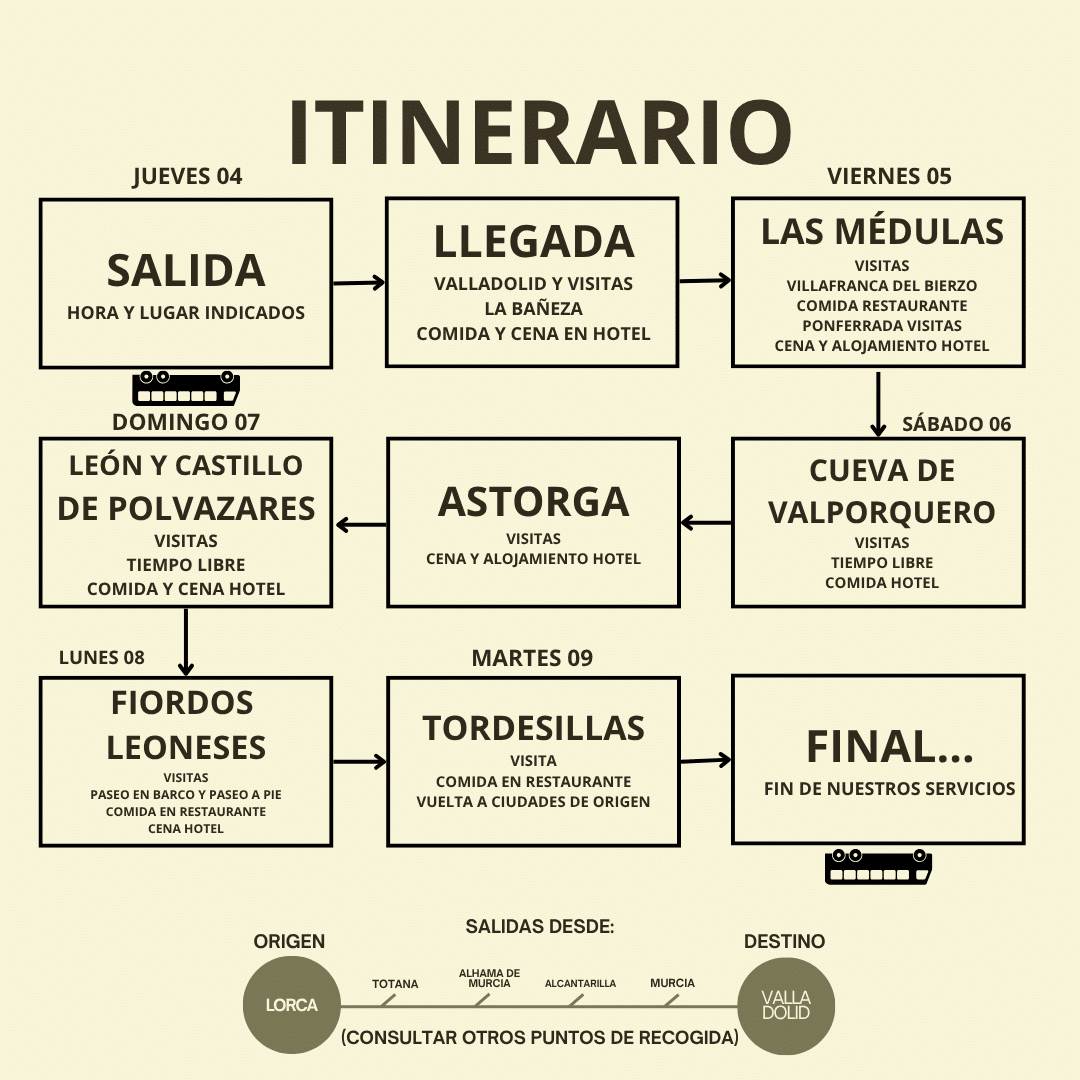 Salida a la hora indicada rumbo a Valladolid, con varias paradas en ruta para mayor comodidad. A la llegada, nos adentraremos en el corazón de la ciudad visitando sus rincones más emblemáticos: elegantes plazas y parques, el Parque de José Zorrilla, la Catedral, el Colegio de San Gregorio y la animada Plaza Mayor. Tras la visita, continuación del viaje hacia La Bañeza. Llegada al hotel, comida y distribución de habitaciones. Por la tarde, tiempo libre para visitar La Bañeza. Regreso al hotel para la cena y alojamiento. Régimen: Pensión completa.