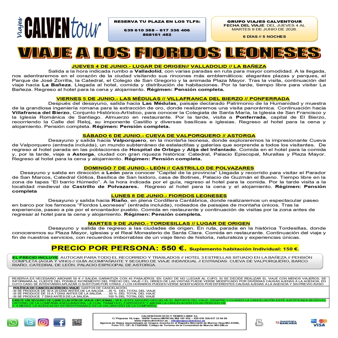 RESERVA ES NECESARIO ABONAR 50 € // SALIDA GARANTIZA CON 45 PASAJEROS. EN CASO DE NO LLEGAR AL CUPO, SI SE DECIDE REALIZAR EL VIAJE CON MENOS VIAJEROS, SE INFORMARÁ AL CLIENTE DEL POSIBLE INCREMENTO DEL PRECIO DEL VIAJE // EL ORDEN DE LAS VISITAS PUEDE VERSE MODIFICADO POR DIVERSAS CAUSAS AJENAS A LA AGENCIA, EN CUYO CASO SE INTENTARÁN APLAZAR O SUSTITUIR POR OTRAS. // LOS HORARIOS PUEDEN VERSE MODIFICADOS POR DIFERENTES CAUSAS AJENAS A LA AGENCIA Y SIN PREVIO AVISO