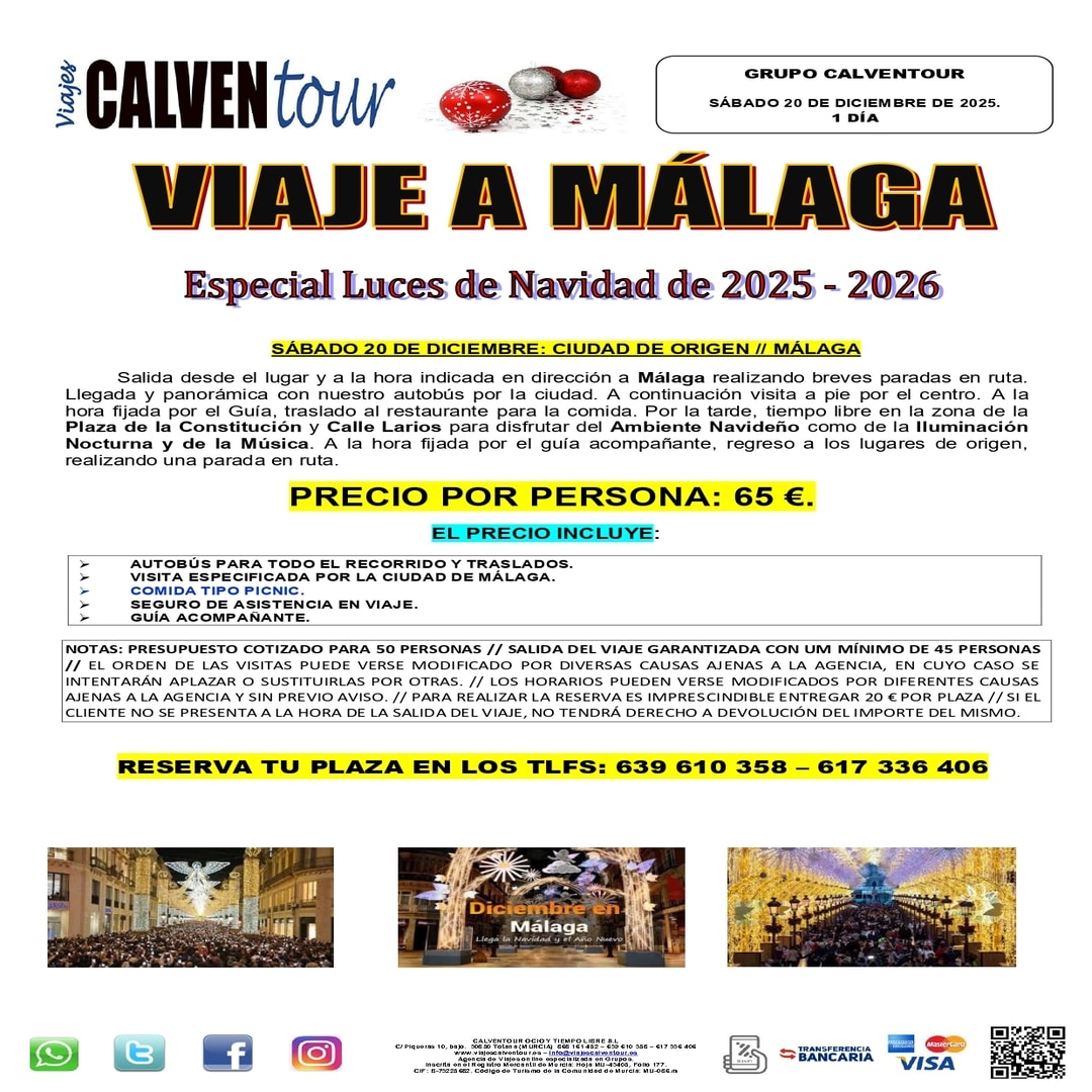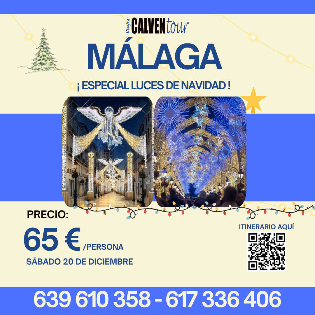 Salida desde el lugar y a la hora indicada en dirección a Málaga realizando breves paradas en ruta. Llegada y panorámica con nuestro autobús por la ciudad. A continuación visita a pie por el centro. A la hora fijada por el Guía, traslado al restaurante para la comida. Por la tarde, tiempo libre en la zona de la Plaza de la Constitución y Calle Larios para disfrutar del Ambiente Navideño como de la Iluminación Nocturna y de la Música. A la hora fijada por el guía acompañante, regreso a los lugares de origen, realizando una parada en ruta.