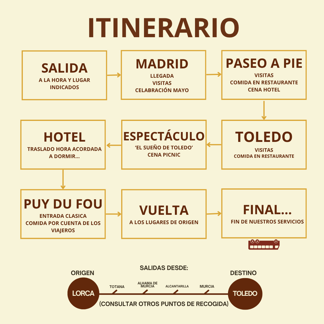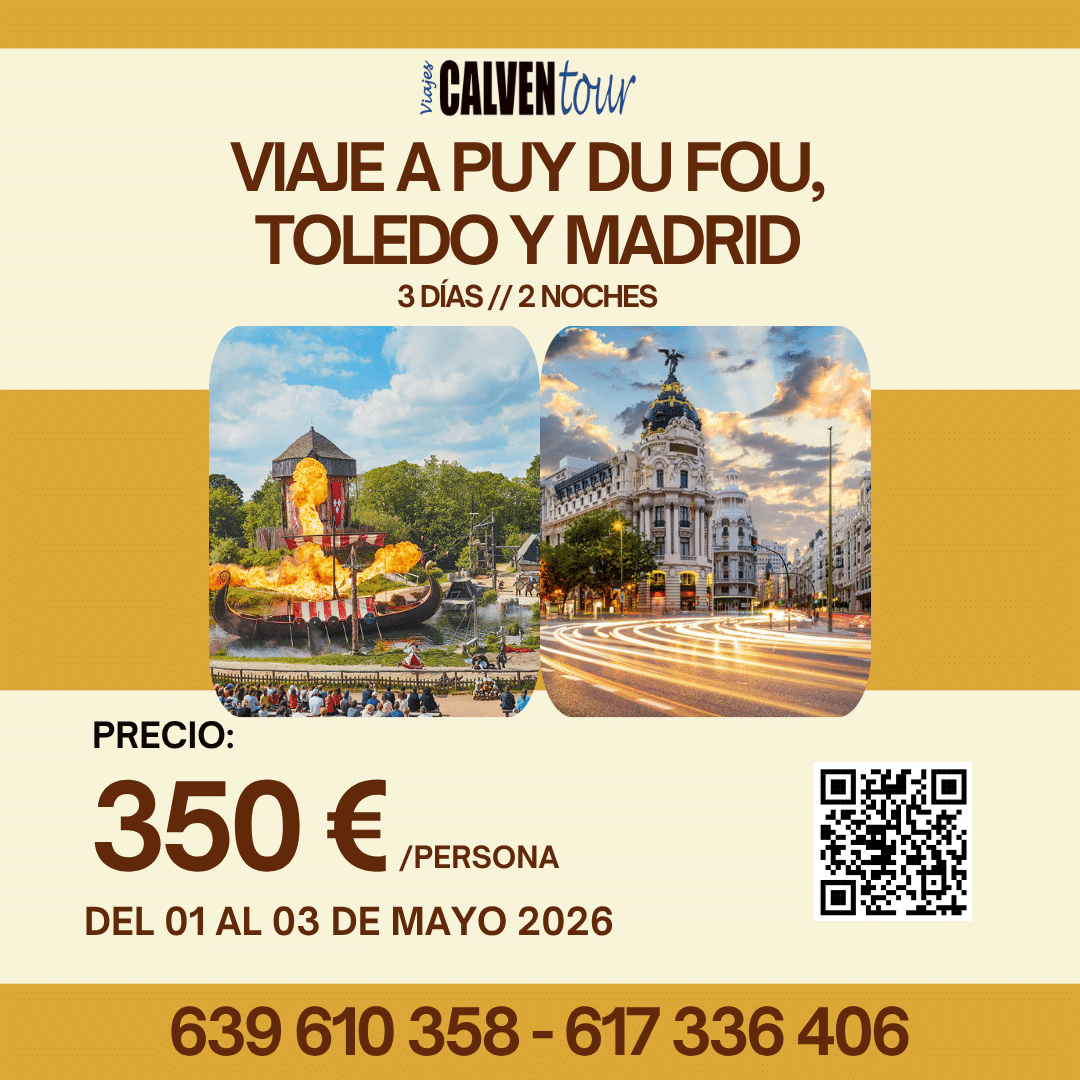 Desayuno y salida hacia la impresionante Toledo, ciudad Patrimonio de la Humanidad y símbolo de convivencia de culturas. Recorreremos sus callejuelas llenas de historia, descubriendo rincones que parecen detenidos en el tiempo. Comida en restaurante y tiempo para seguir explorando su riqueza monumental. Al caer la tarde, viviremos uno de los momentos más esperados del viaje: traslado al espectacular Puy du Fou España. Allí nos aguarda “El Sueño de Toledo” (22:00 h), un impresionante espectáculo nocturno que combina historia, emoción y una puesta en escena única en Europa. Cena picnic. Al finalizar, regreso al hotel y alojamiento. Una noche que quedará grabada para siempre. Régimen: pensión completa