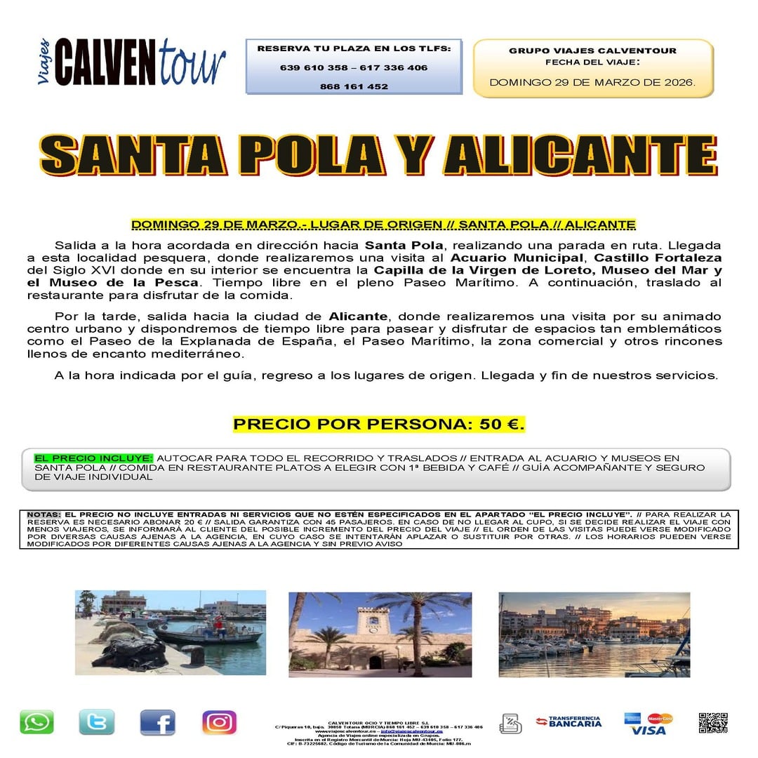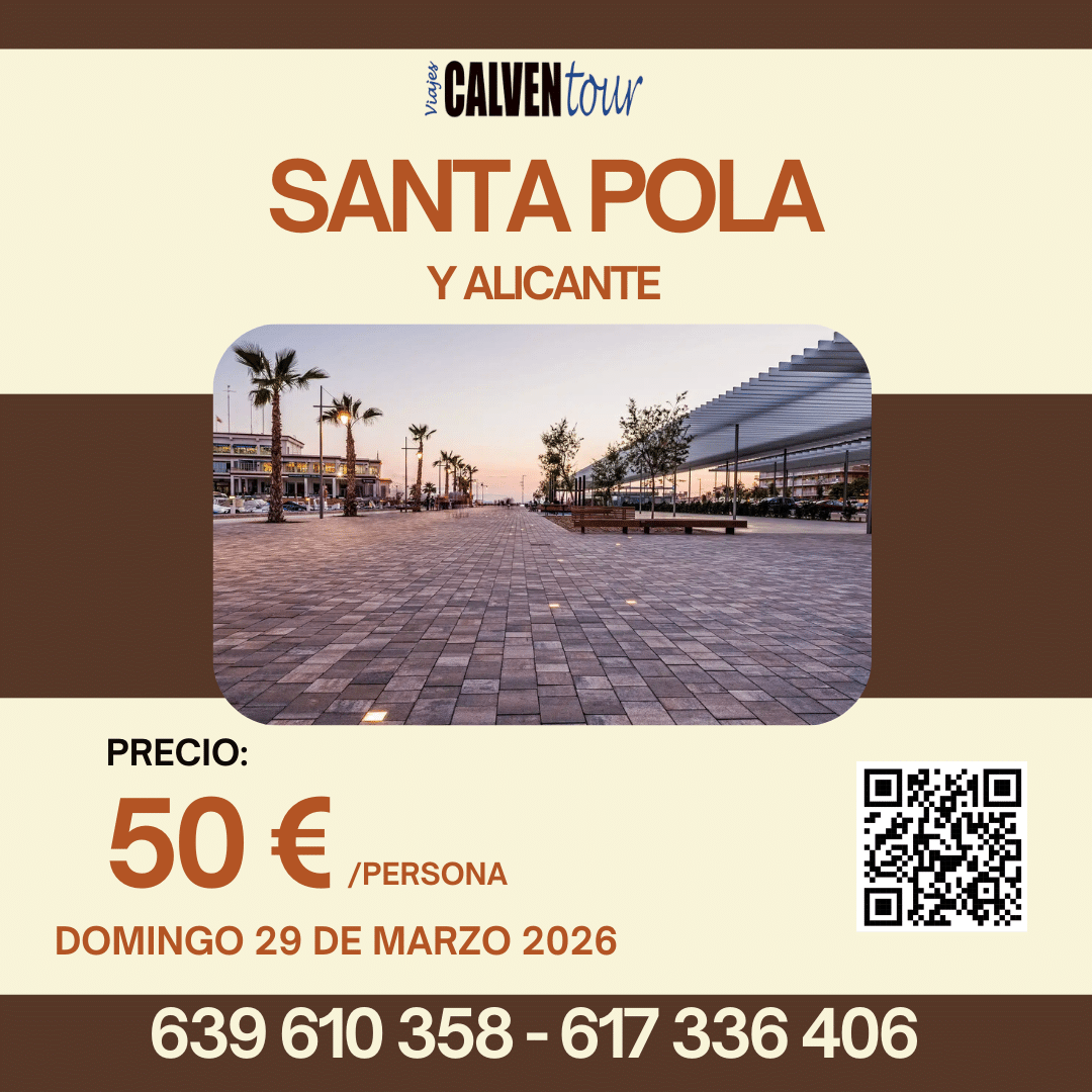 Salida a la hora acordada en dirección hacia Santa Pola, realizando una parada en ruta. Llegada a esta localidad pesquera, donde realizaremos una visita al Acuario Municipal, Castillo Fortaleza del Siglo XVI donde en su interior se encuentra la Capilla de la Virgen de Loreto, Museo del Mar y el Museo de la Pesca. Tiempo libre en el pleno Paseo Marítimo. A continuación, traslado al restaurante para disfrutar de la comida.