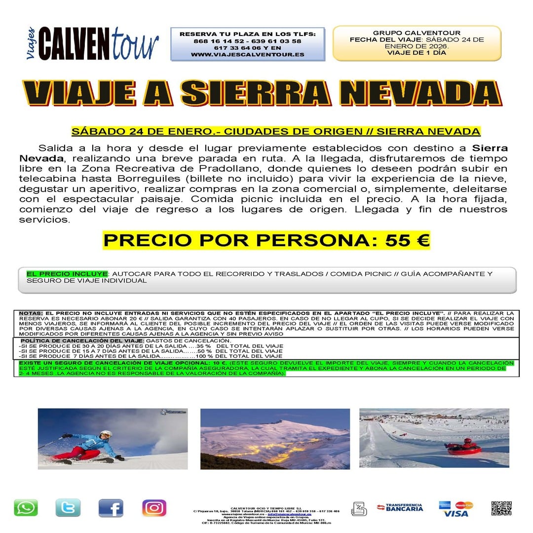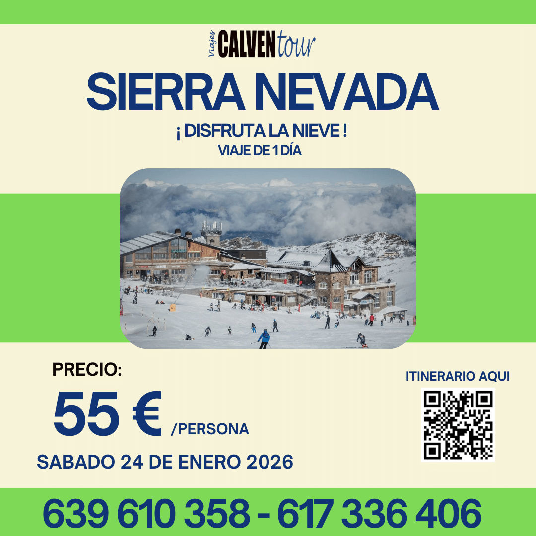 Salida a la hora y desde el lugar previamente establecidos con destino a Sierra Nevada, realizando una breve parada en ruta. A la llegada, disfrutaremos de tiempo libre en la Zona Recreativa de Pradollano, donde quienes lo deseen podrán subir en telecabina hasta Borreguiles (billete no incluido) para vivir la experiencia de la nieve, degustar un aperitivo, realizar compras en la zona comercial o, simplemente, deleitarse con el espectacular paisaje. Comida picnic incluida en el precio. A la hora fijada, comienzo del viaje de regreso a los lugares de origen. Llegada y fin de nuestros servicios.
