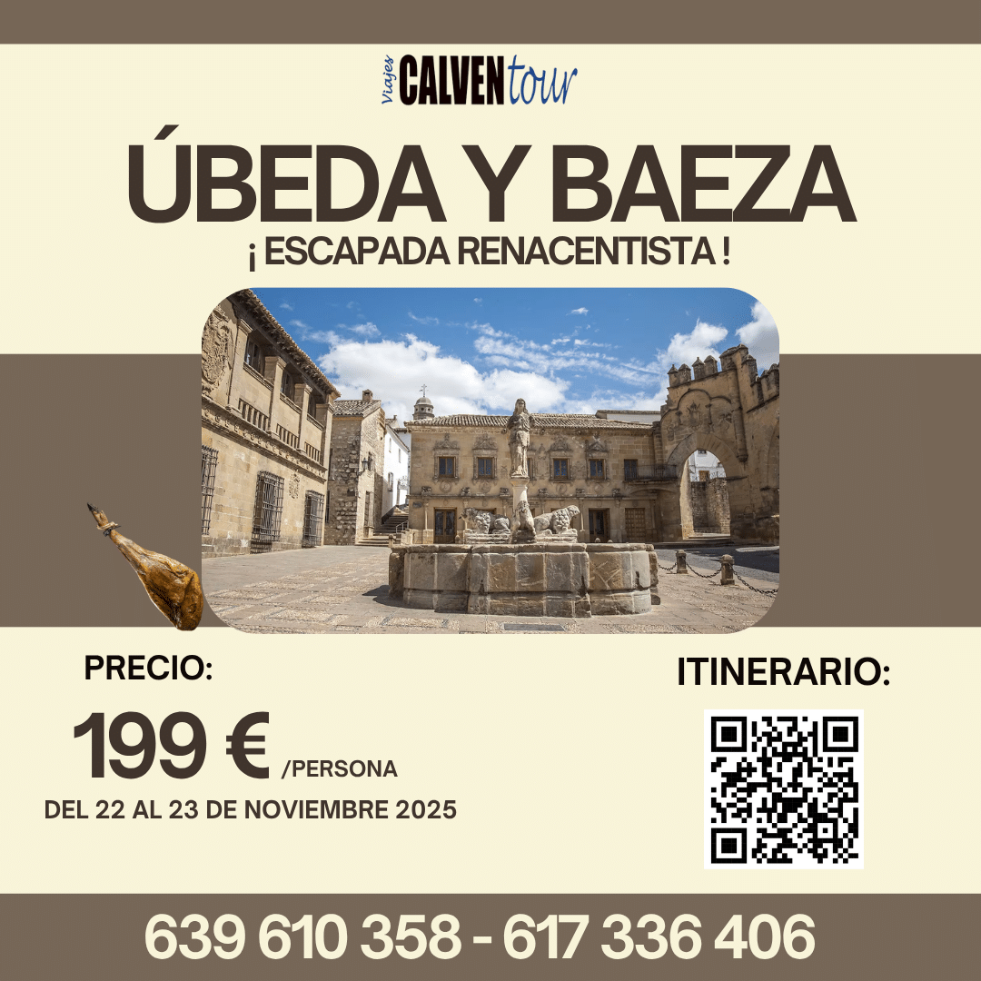 Salida desde los diferentes puntos de origen rumbo a la histórica Úbeda, con breves paradas en ruta. A la llegada, pasearemos por sus calles monumentales y descubriremos rincones llenos de encanto. Traslado al hotel para la comida y la distribución de habitaciones. Por la tarde, excursión al Santuario de la Virgen de la Fuensanta (Patrona de las Villas), visita a la plaza de toros y deliciosa degustación de mermeladas, patés y aceite de oliva. Regreso al hotel, cena, animación y alojamiento. Régimen: Pensión Completa.