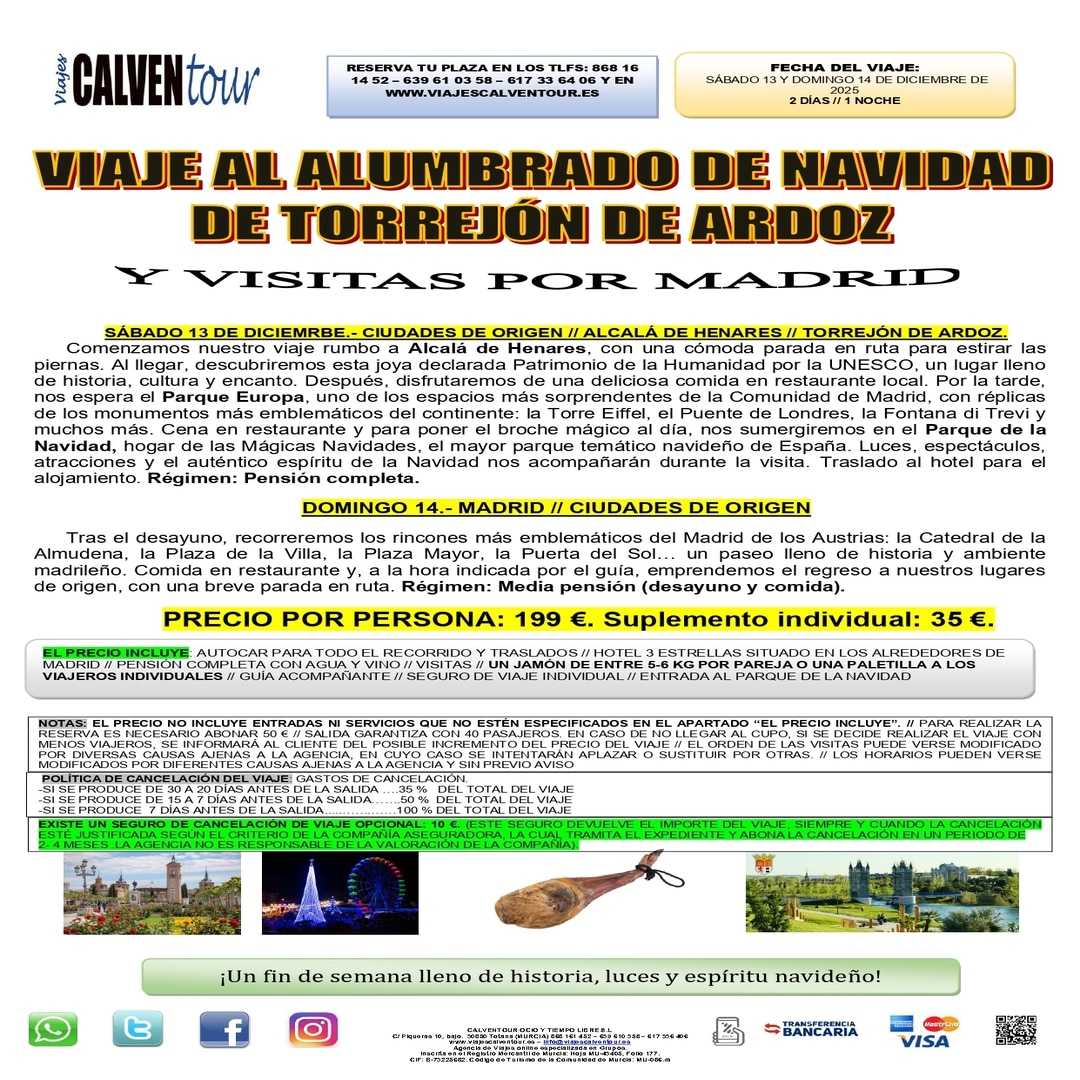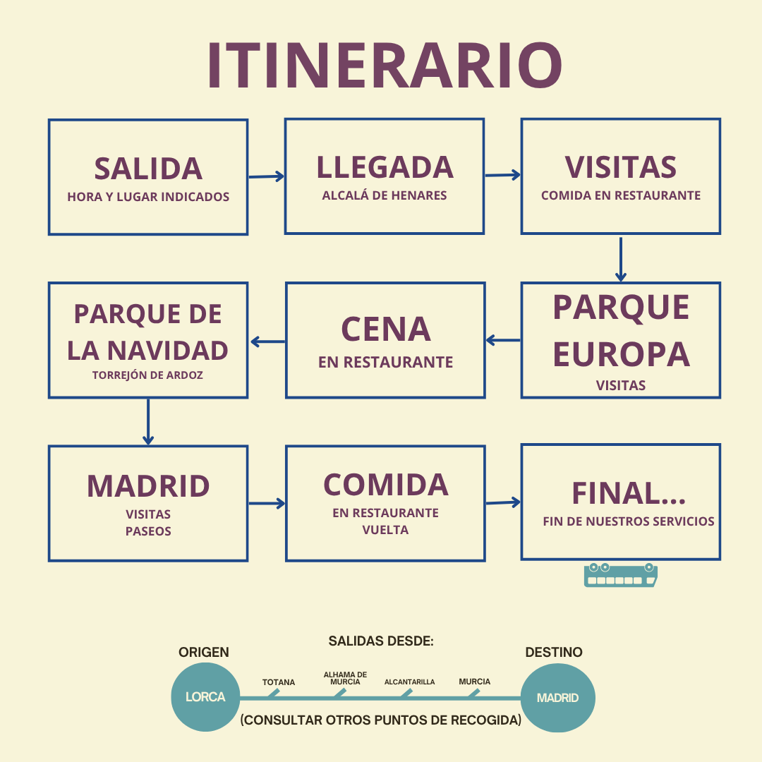 Comenzamos nuestro viaje rumbo a Alcalá de Henares, con una cómoda parada en ruta para estirar las piernas. Al llegar, descubriremos esta joya declarada Patrimonio de la Humanidad por la UNESCO, un lugar lleno de historia, cultura y encanto. Después, disfrutaremos de una deliciosa comida en restaurante local. Por la tarde, nos espera el Parque Europa, uno de los espacios más sorprendentes de la Comunidad de Madrid, con réplicas de los monumentos más emblemáticos del continente: la Torre Eiffel, el Puente de Londres, la Fontana di Trevi y muchos más. Cena en restaurante y para poner el broche mágico al día, nos sumergiremos en el Parque de la Navidad, hogar de las Mágicas Navidades, el mayor parque temático navideño de España. Luces, espectáculos, atracciones y el auténtico espíritu de la Navidad nos acompañarán durante la visita. Traslado al hotel para el alojamiento. Régimen: Pensión completa.